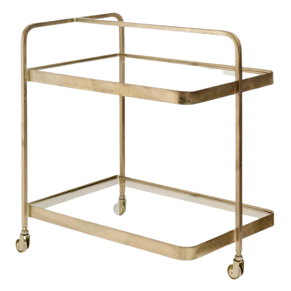 Dieser Eisenrollwagen mit Glas ist eine kleine Lagereinheit. Es ist ein minimalistisches Möbelstück, das als Beistelltisch neben dem Sofa oder als stilvoller Barwagen für Flaschen und Gläser verwendet werden kann. Mit seiner goldenen Oberfläche ist dieser Einkaufswagen ein wirklich schickes Accessoire, das sowohl praktisch als auch funktionell ist. Es hat eine Abmessung von 70x50x75 cm.