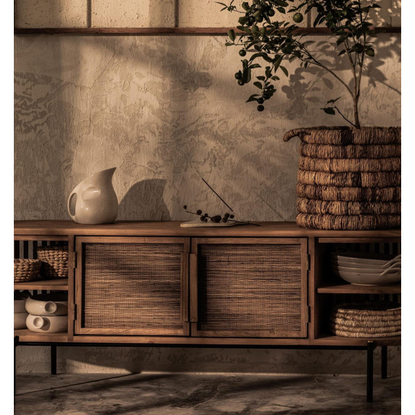 Das Coco Sideboard mit 2 Türen und 4 offenen Regalen ist ein herrliches Möbelstück, das Sie mit Sicherheit verführen wird. Dieses Möbelstück besteht aus wiedergewonnenem Teakholz, Eisen und handgefertigten Geweben aus der zentralen Ader der Kokosnusspalmenblätter und ist ein wahres Meisterwerk der Handwerkskunst. Die Holzkonstruktion ist leicht geneigt, was dem Design einen sehr eleganten Touch verleiht. Die Coco Dresser ist ein einzigartiges Möbelstück, das Ihrem Zuhause einen Hauch von Authentizität und Charme verleiht.