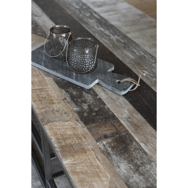 Der rechteckige Couchtisch der Kollektion TUAREG ist eine Kreation der Marke d-Bodhi. Er ist aus recyceltem Teakholz mit einem Rahmen aus schwarzem Metall gefertigt.