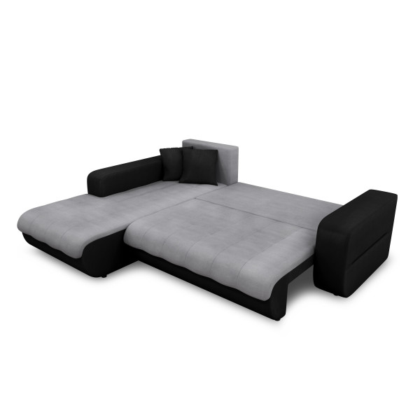 Dieses große Ecksofa im modernen Stil verfügt über eine breite Chaiselongue, die es Ihnen ermöglicht, schöne Momente mit der Familie zu verbringen. Es kann auch in ein Doppelbett umgewandelt werden, um Gäste ganz einfach zu empfangen. Die Vielzahl an Bezügen und Farben ermöglicht es Ihnen, den Stil Ihres Interieurs genau nach Ihren Wünschen zu gestalten. Zwei farblich abgestimmte Kissen werden mit dem Sofa für noch mehr Komfort geliefert.