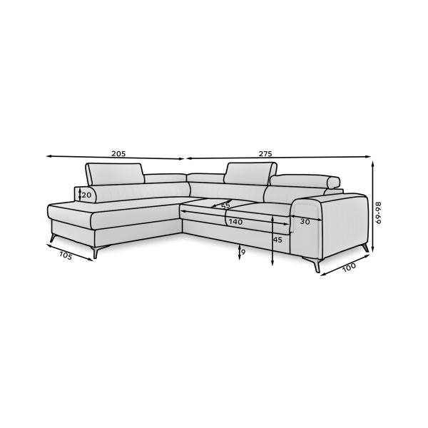 Dieses Laurence Ecksofa verschönert das Wohnzimmer und wird zu einem friedlichen und anmutigen Ort zum Entspannen. Es besteht aus einem robusten Stoff für die Polsterung und einem Fuß aus verchromtem Stahl, der diesem Sofa ein ansonsten bezauberndes Modell verleiht. Das Modell ist in einer kompletten Farbpalette für die verschiedenen Arten von Eltap-Stoffen mit einer Gesamtabmessung von 275 x 205 x 98 cm und einer bequemen Sitzhöhe von 45 cm erhältlich. Es ist ein Sofa, das in einem Schlafbereich von 125x210 cm in ein Bett umgewandelt werden kann.