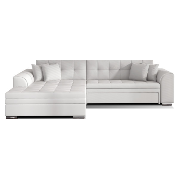 Dieses Sorento-Ecksofa eignet sich für moderne und unendlich elegante Innenräume. Es ist mit einem hochwertigen Stoff mit verchromten Beinen bezogen, der fabelhaft aussieht. Es verfügt über eine Gesamtabmessung von 295 x 195 x 80 cm, die sich auch gut als Wohnzimmer-Schmuckstück eignet und viel Platz zum Entspannen nach einem langen Tag bietet. Es kann auch in ein großes 210x126 cm großes Bett umgewandelt werden, um nachts zu schlafen. Es gibt eine große Auswahl an zweifarbigen Kombinationen, sodass es unglaublich einfach ist, die richtige Oberfläche für den Innenraum zu finden.