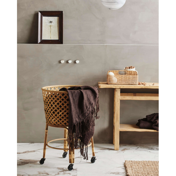 Ein runder Korb von Arvi verleiht der Dekoration des Raums einen authentischen und handwerklichen Look. Dieser Korb aus Rattan- und Bambusrädern ist langlebig und bietet maximalen Stauraum im Raum. Dieser Arvi-Wagen hat eine Größe von ø57,5 x 80 cm und verfügt über Räder, die seine Bewegung erleichtern.