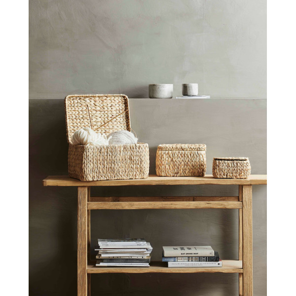 Dieses Set aus 3 Aufbewahrungsboxen von Osa ist die perfekte multifunktionale Aufbewahrungslösung für jeden Raum im Haus. Sie sind von Hand aus Sackleinen und Hyazinthen gewebt. Deckel helfen dabei, wichtige Dinge an einem Ort zu halten. Die Boxen messen 40 x 30 x 25 cm, 30 x 22 x 19 cm und 22 x 16 x 11,5 cm.