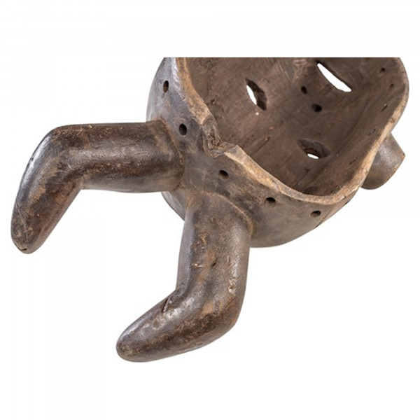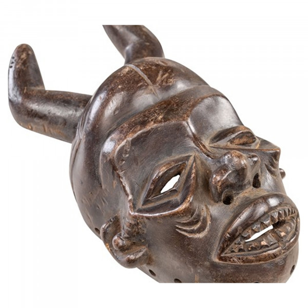 Diese Bene Lulua Wandkunstsammlung von Versmissen vereint eine ungewöhnliche und verspielte Ästhetik und bietet antikes ethnisches Design in einem Interieur. Diese Maske besteht aus Holz mit einer sehr glänzenden braunschwarzen Oberfläche. Es stammt aus der Mitte des 20. Jahrhunderts und soll ursprünglich aus der DR Kongo ein Symbol männlicher Macht und ein hochrangiger Würdenträger namens „Migone“ gewesen sein. Es hat eine Größe von 12,5 x 16,5 x 31 cm.