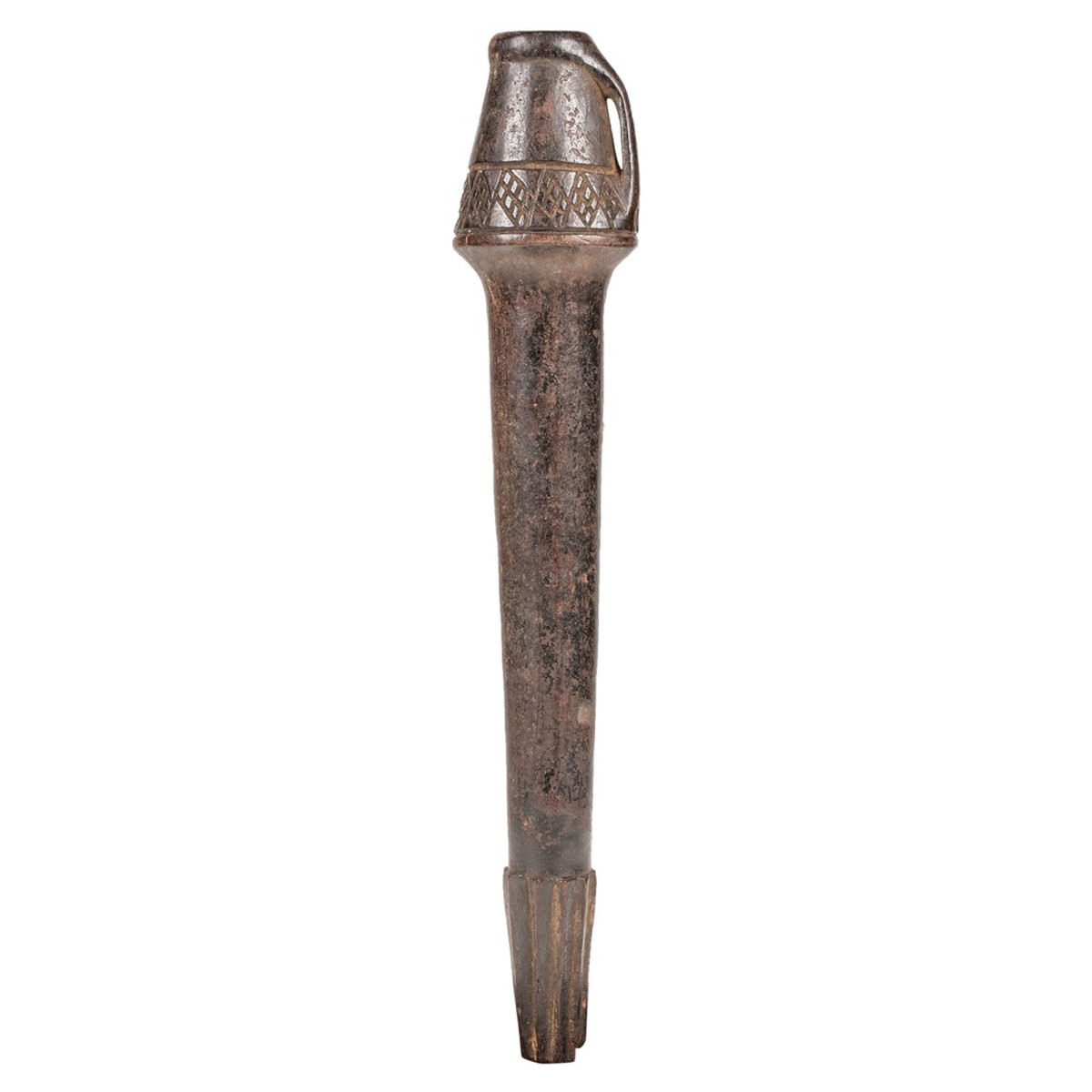 Die figurativen Mvwala-Stäbchen, herausragende Autoritätssymbole im Kongo, fungierten als „Kommunikationskanal und Symbol der Legitimität“, das Vorfahren mit den Lebenden verband. Diese natürliche Holzskulptur stammt vom Stamm der Yombe in der Demokratischen Republik Kongo und stammt aus dem 20. Jahrhundert. Sie ist 5 x 5,5 x 32 cm groß. Die Ikonographie dieses Stabes spiegelt die Prinzipien des kongolesischen Stammestums wider und unterstreicht die zentrale Rolle der Frau. Dieses einzigartige Stück ist ein außergewöhnliches Artefakt und zeugt vom tiefgreifenden kulturellen und symbolischen Erbe der Yombe.