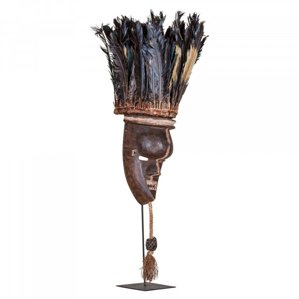 Diese atemberaubende AAA1075 Mukinka-Maske ist ein wahres Stück afrikanischer Kunst aus Zaire aus dem 20. Jahrhundert. Es ist ideal für die Dekoration der Wände eines antiken und ethnischen Zimmers. Dieses dekorative Objekt ist einzigartig dank seiner Materialien, die in Naturholz geschnitzt und mit Federn mit Seilen gekrönt sind. Diese Maske wird für Beerdigungen oder wichtige Zeremonien verwendet. Dieses hübsche Mukinka-Ornament hat eine Abmessung von 41x37x98 cm.