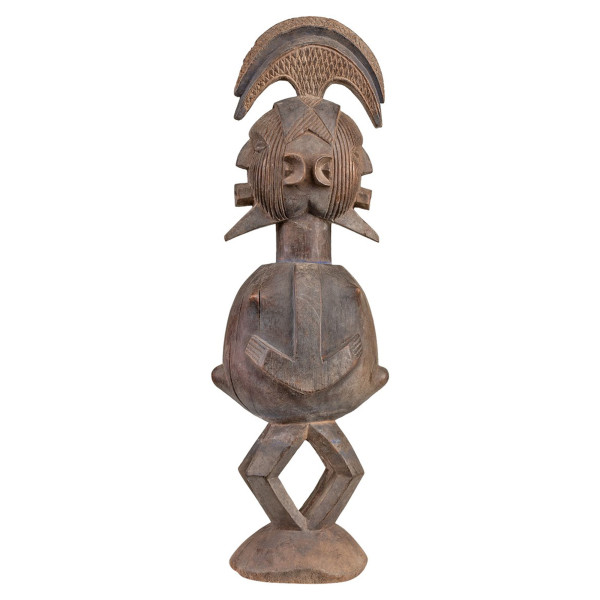 Die Janus Matomba-Skulptur ist ein Holzwerk mit den Maßen 29x16x61 cm. Sie stammt vom Stamm der Téké in der DR Kongo und stammt aus der Mitte des 20. Jahrhunderts. Diese einzigartige Figur, die von den Tekes geformt wurde, zeichnet sich durch leicht gebeugte Beine, einen säulenförmigen Rumpf aus, der von rechtwinklig gebogenen Armen umrahmt wird, und einen vergrößerten Kopf mit typischen linearen Gesichtsnarben und einem