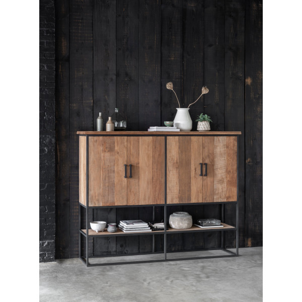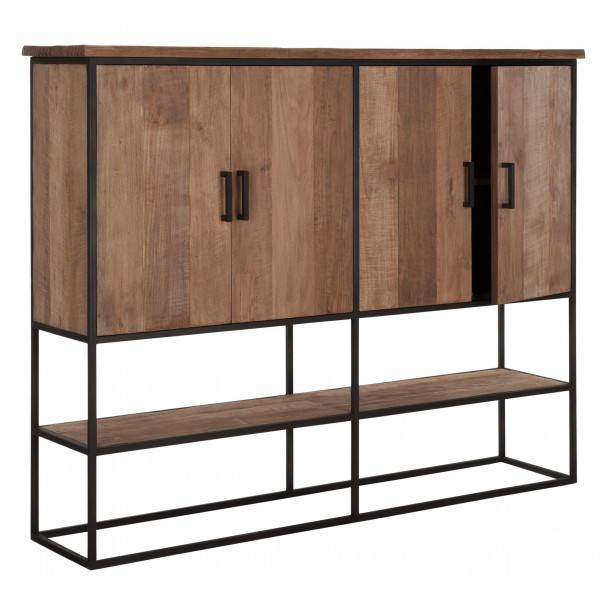 Der breite Schrank Beam besteht aus recyceltem Teakholz und einer Metallstruktur. Er misst 180x40x140 cm, verfügt über 4 Türen und ein offenes Regal.