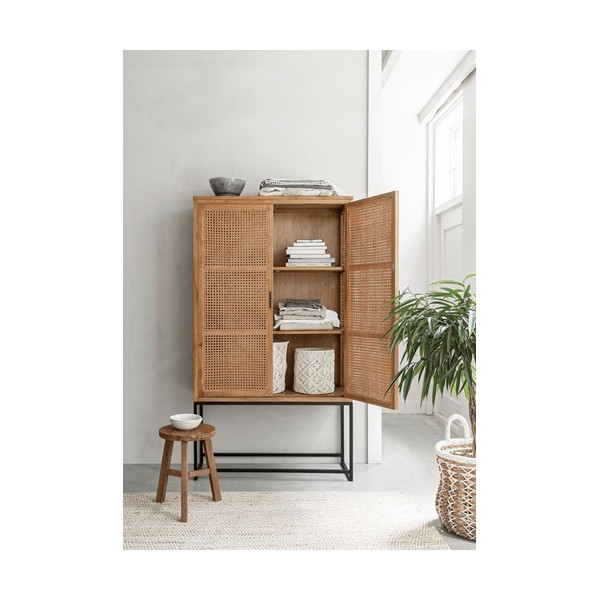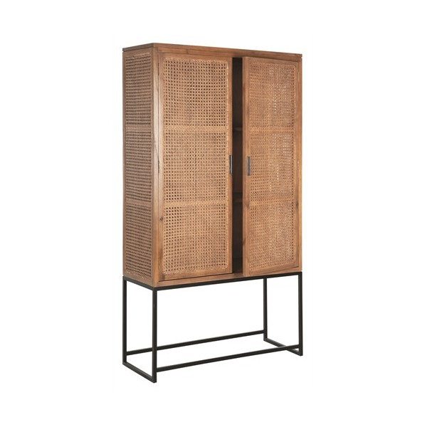 Dieser Tribute-Kleiderschrank ist extrem stilvoll, um einen industriellen Touch zu erzeugen. Der Schrank besteht aus Rattan, Mindi-Holz und Riemen. Die weiche natürliche Farbe passt zu seiner schwarzen Metallbasis. Es besteht aus zwei Türen. Es bietet ausreichend Stauraum.