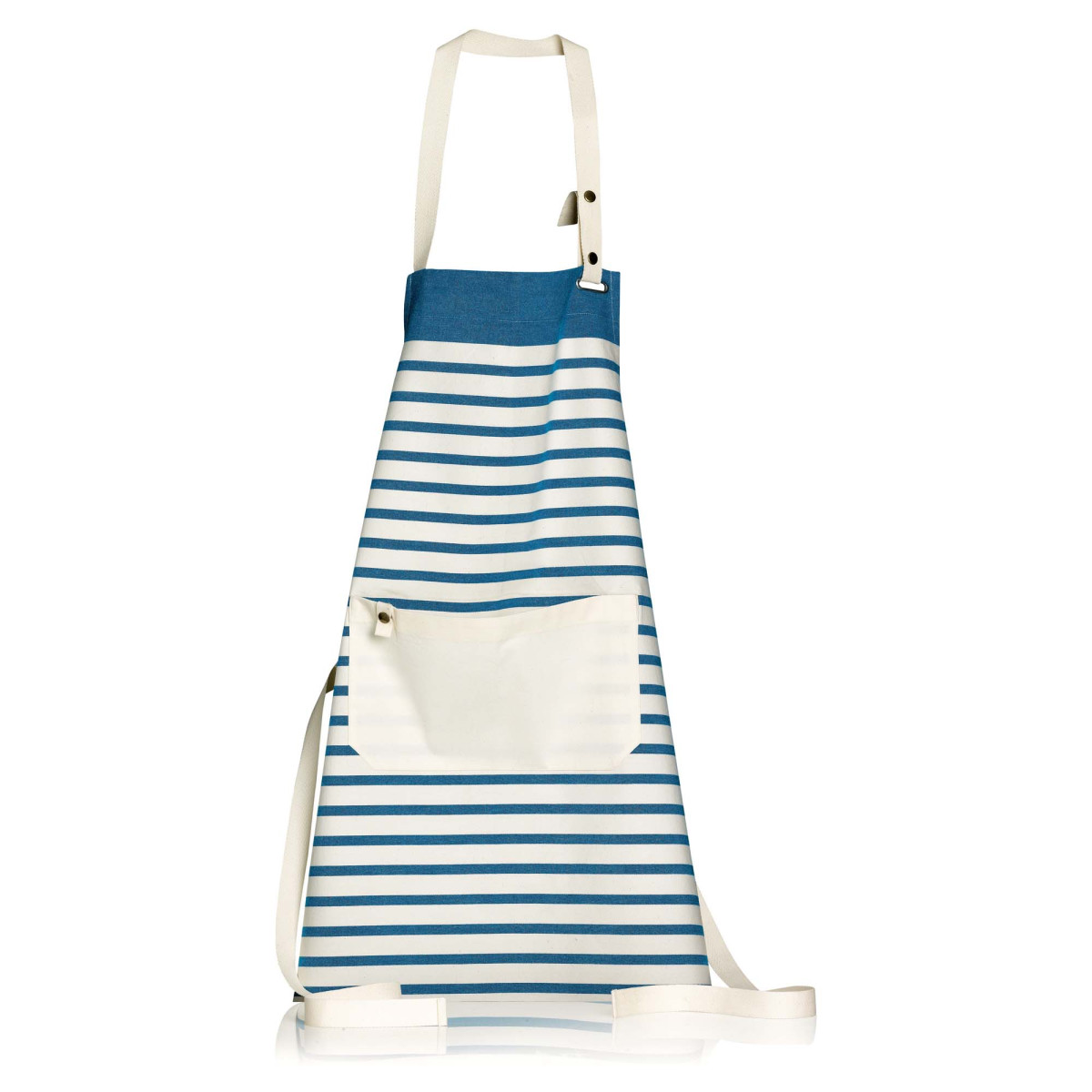 Diese Nalou Küchenschürze aus 100% Baumwolle mit gestreiftem Design ist perfekt. Diese Schürze hat eine verstellbare Schnalle, die effektiv schützt und gleichzeitig der Küche eine erhabene Note verleiht. Die elfenbeinfarbene und blau gestreifte Farbe sieht in der Küche gut aus. Es hat eine Abmessung von 72x75 cm.