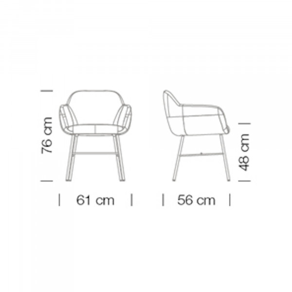 Der Sessel Myra 653 besteht aus einem gepolsterten Sitz und einer Rückenlehne, einer Stoffpolsterung und einem 4-Fuß-Stahlgestell. Er misst 61x56x76 cm bei einer Sitzhöhe von 48 cm.
