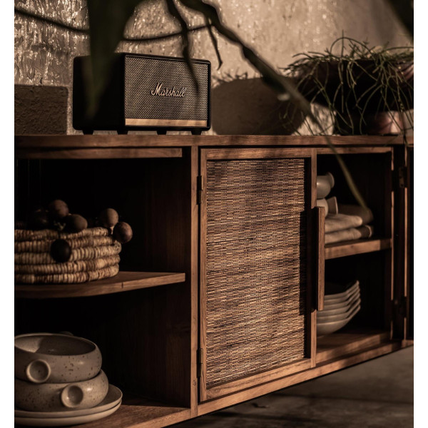 Този шкаф на Coco с 2 врати и 4 отворени рафта е спираща дъха мебел, истински шедьовър на изработката, който веднага хваща окото. Тази мебел е изработена от регенерирано тиково дърво, желязо и ръчно изработени тъкани, направени от централната вена на кокосови листа. Лек ъгъл върху дървената рамка осигурява допълнително докосване на дизайна, за да завърши външния вид. Със своите размери 160х44х70 см, скринът Coco е просторна и практична мебел за съхранение на
