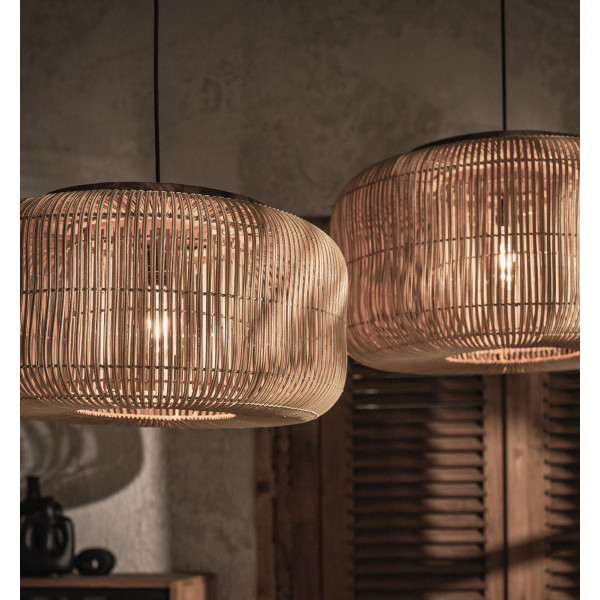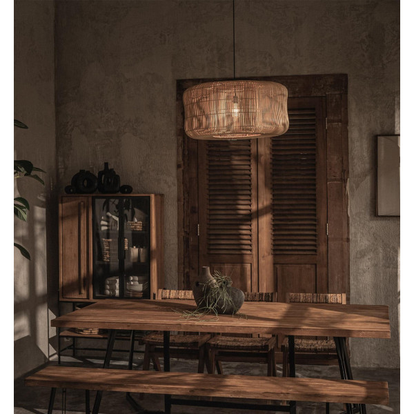 Висящият полилей Bucket е истински декоративен елемент благодарение на великолепната си отворена структура. Изцяло ръчно изработен от висококачествен ратан, завършен е с тиково плот. Висящата лампа Bucket осигурява красив източник на естествена светлина в стаята и е истински привличащ вниманието. Без значение къде го окачите, той се предлага в различни размери и цветове.