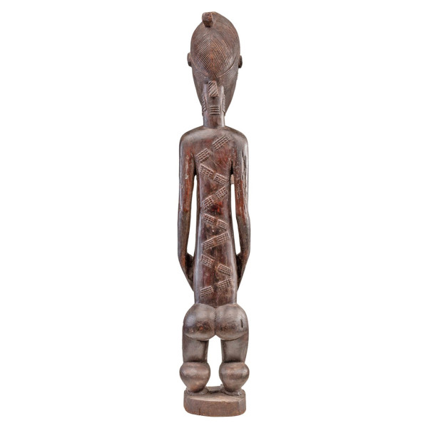 Тази забележителна фигура на плодовитостта на Baoulé, произхождаща от Кот д'Ивоар, има подробни скарификации на предната и задната част на тялото. Хората от Бауле се отличават, като използват скулптура за естетически и ритуални цели. Издълбан в дърво, той е с размери 21х16,5х94 см и датира от средата на 20 век, представлявайки изкуството и духовността на