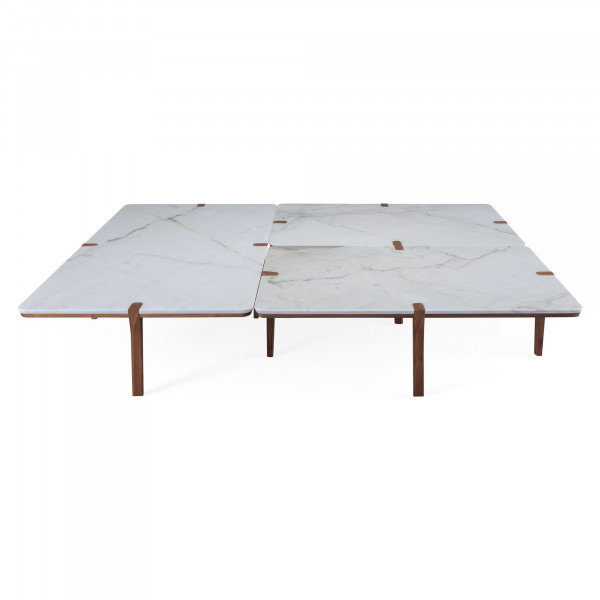 Правоъгълната холна маса Corner е проектирана от дизайнера Пиер Дубург, за да наруши класическата позиция на краката на повечето маси, като ги постави на места, които осигуряват стабилност и оставят ъглите свободни. Тази висококачествена маса е изработена от крака и основа от масивно орехово дърво и плот от мрамор.