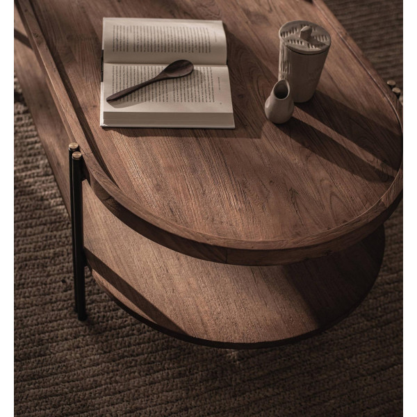 за кафе Coco с 2 върха е уникално парче от този вид. Тя е изработена от висококачествен рекултивиран тик, работил по традиционен начин от нашите квалифицирани майстори. Тази двустепенна овална маса има горна повърхност с повдигнат ръб и интегрирана подвижна тава. Неговата фина черна желязна рамка допълва модерния облик на масата, като същевременно добавя нотка на елегантност. Тази маса е мебел, която съчетава качество, функционалност и стил.