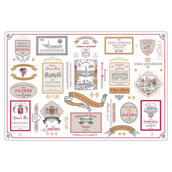 Подложката за маса Bordeaux е незаменим аксесоар за маса. Тя е изработена от 100% полипропилен и е декорирана с илюстрация на големите вина от Бордо. Съдържа илюстрация на тези вина, която представя техните етикети и емблематични цветове. Тази многоцветна подложка за маса е налична в размер 30x45 см и се продава в комплект от 6 броя.