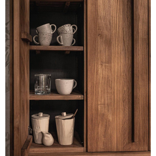 Гардеробът Outline с 3 врати и 1 отворен рафт е мебел, богата на дърво и с чист силует, лесна за съответствие с всеки интериорен стил. Вратите отдясно се отварят, за да разкрият три подвижни рафта, докато вратата отляво крие четири по-малки, което ви позволява да държите вещите си организирани и далеч от погледа. Ръчно изработен от регенериран тик и желязо, този шкаф е с размери