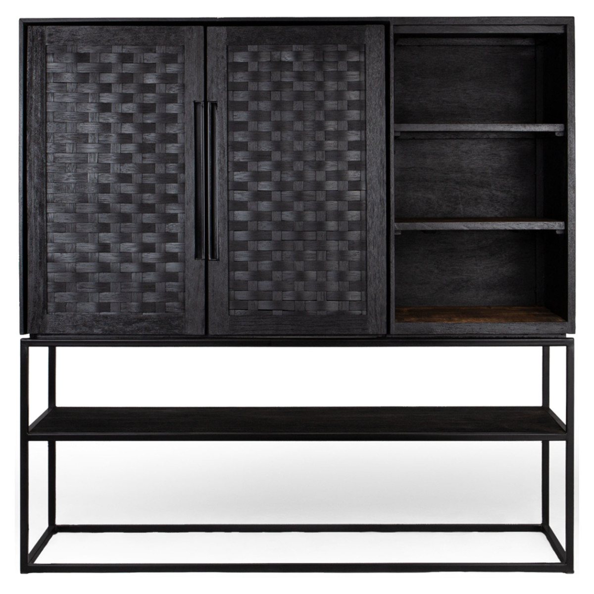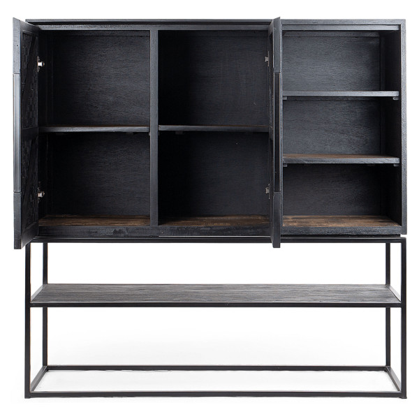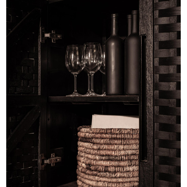 Този шкаф Karma Charcoal е универсална мебел, която е ръчно изработена от регенерирано дърво. Разполага с две красиво структурирани, ръчно тъкани ратанови врати, обработени с екологично черно матово покритие. Поставката и рафтовете са идеални за показване на любимите ви аксесоари, останалите могат да се съхраняват лесно. Студената желязна рамка допринася за винтидж индустриалния вид. Шкафът е с размери 140х45х140 см.