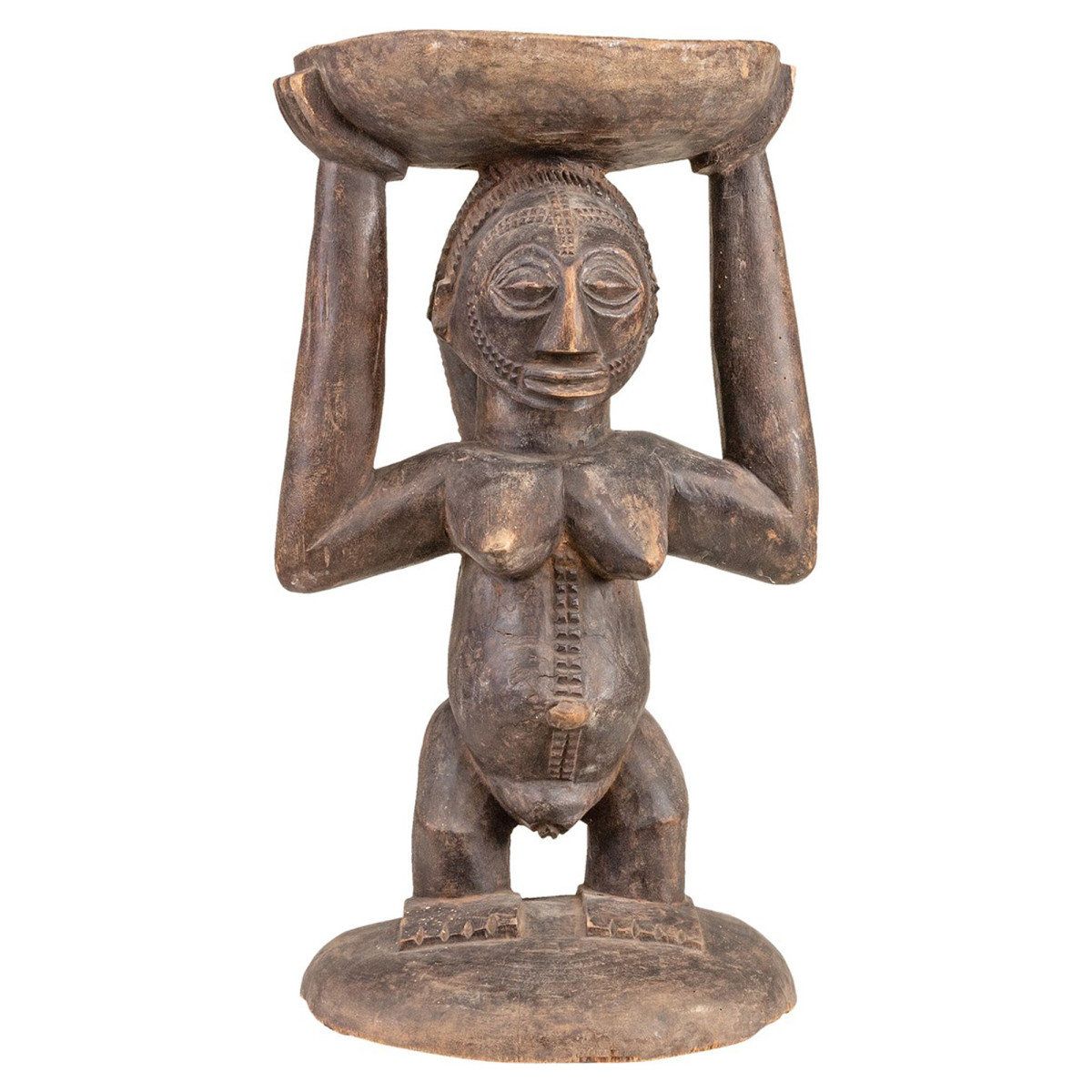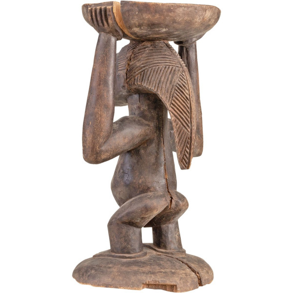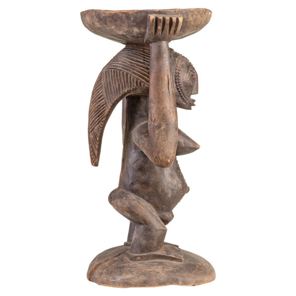 Тази табуретка Luba от 20-ти век е уникално и поразително произведение на изкуството. Изработена е от естествено дърво и е с размери 23х26,5х48 см. Кариатидът, поддържащ тавата, е представяне на жена Луба, облечена в традиционна рокля и носеща поднос на главата си. Детайлите на скулптурата са забележителни, а жената е представена с вечна грация и достойнство. В този контекст жената, представена на табуретката, представлява мъдростта и силата на наследството на Луба. Това столче е забележително произведение на изкуството, което предлага поглед към културата и традициите на народа Луба. Това е уникално и ценно произведение на изкуството, което заслужава да бъде възхитено