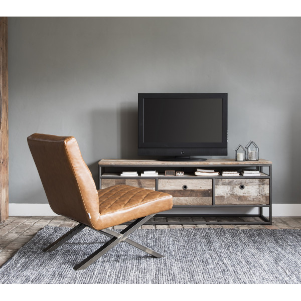ТВ шкафът Tuareg е изработен от рециклирано тиково дърво и има рамка от черен метал. Стойката се предлага в два размера и разполага с три чекмеджета.
