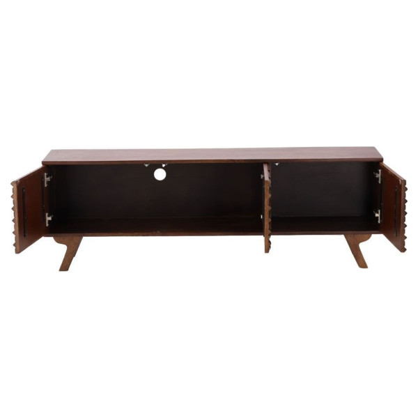 Телевизионната стойка Alexandre от Athezza има оригинален и уникален външен вид. Изработен от манго дърво в кафяв нюанс, този шкаф се състои от три врати. Дизайнът без дръжки поддържа гладка естетика по цялата дължина, с магнитна система за отваряне. Корпусът с двойна врата е оборудван с кабелни проходи, предлагащи практично решение за аудио-визуална техника. Геометричните шарки и краката добавят нотка на ретро стил към тази функционална странична маса. Със своите размери 150х40х50 см, тази мебел предлага много място за съхранение на кутии, видео игри, книги и други аксесоари. Телевизионната стойка Alexandre by Athezza внася елегантност и нотка на оригиналност в интериорния дизайн.