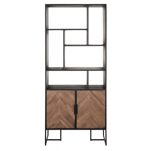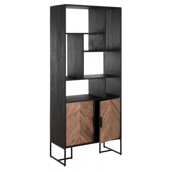 Kouzlo knihovny spočívá v její dřevěné konstrukci a kovové základně. Její styl je zároveň útulný a moderní. Nábytek měří 80x40x185 cm a má 2 dveře a 7 úložných prostorů.