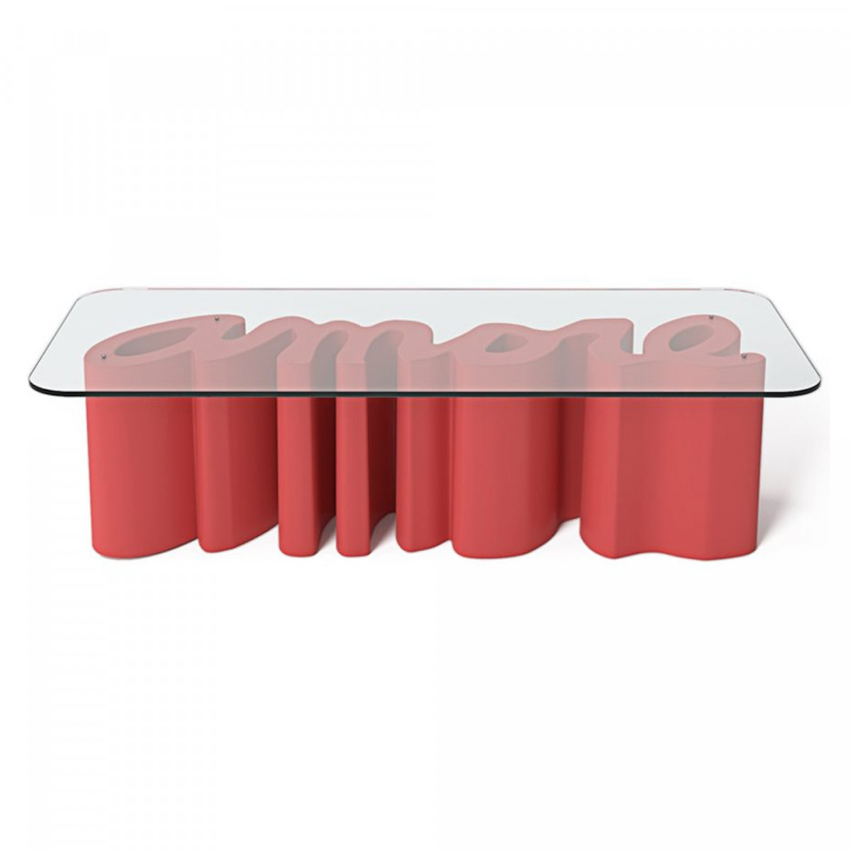 Se stolkem Amore přidejte do svého života lásku. Vyrobený z polyethylenu s průhlednou tvrzenou skleněnou deskou je dokonale vhodný pro vnitřní i venkovní použití. Nabízí záměrně moderní vzhled s půvabnými křivkami díky stylizovanému nápisu Amore. Díky výběru typických energetických barev je tento stolek ideální pro vybavení jakéhokoli typu prostoru: restaurace, hotel, dům, zahrada atd. Stolek měří 170x70x46 cm a byl navržen slavným designérem Giò Colonna Romano.