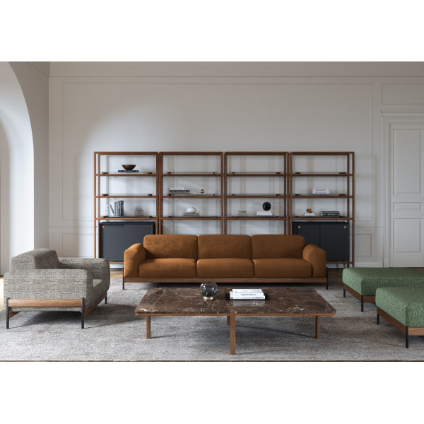 Křeslo Bowie je modulární, měkké a vyvážené. Je navrženo tak, aby bylo příjemné, pohodlné a aby se hodilo jak do obývacího pokoje, tak do hotelové haly. S jednoduchým poutavým detailem hraje struktura křesla mezi štíhlým vzhledem kovu a robustností ořechového dřeva. Jeho rozměry jsou 113x90x75 cm. Řada Bowie je dílem designéra Gonçala Campose.