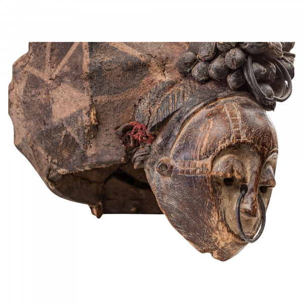Chcete-lipřidat starožitnou a etnickou výzdobu stěn, je tato maska pozoruhodná v každé místnosti. Tento krásný ornament je vyroben výhradně ze dřeva, kovu s látkou a pokrytý cowrie skořápkami a koženými zvonky. Má rozměr 5x17x32,5 cm. Tato maska Suku je jedinečná a překvapivá díky svému původu v DR Kongu chodit s někým zpět do 20. století.