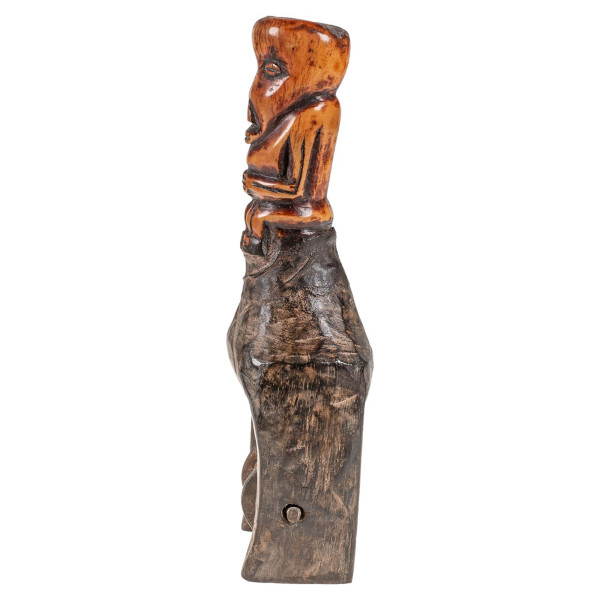 Tato jedinečná socha představuje kladku tkalcovského zařízení, konkrétně sochu Lega Heddle Pulley, z kmene Lega v Demokratické republice Kongo. Tento kus pochází z poloviny 20. století a měří 5x7x19 cm. Je vyroben ze dřeva a obsahuje drát. Kladka se vyznačuje stylizovaným tvarem s výraznými potisky a vzory a má patinu, která naznačuje opakované použití. Tento ručně vyrobený předmět byl použit v procesu tkaní a odráží umění a kulturu lidí Leg