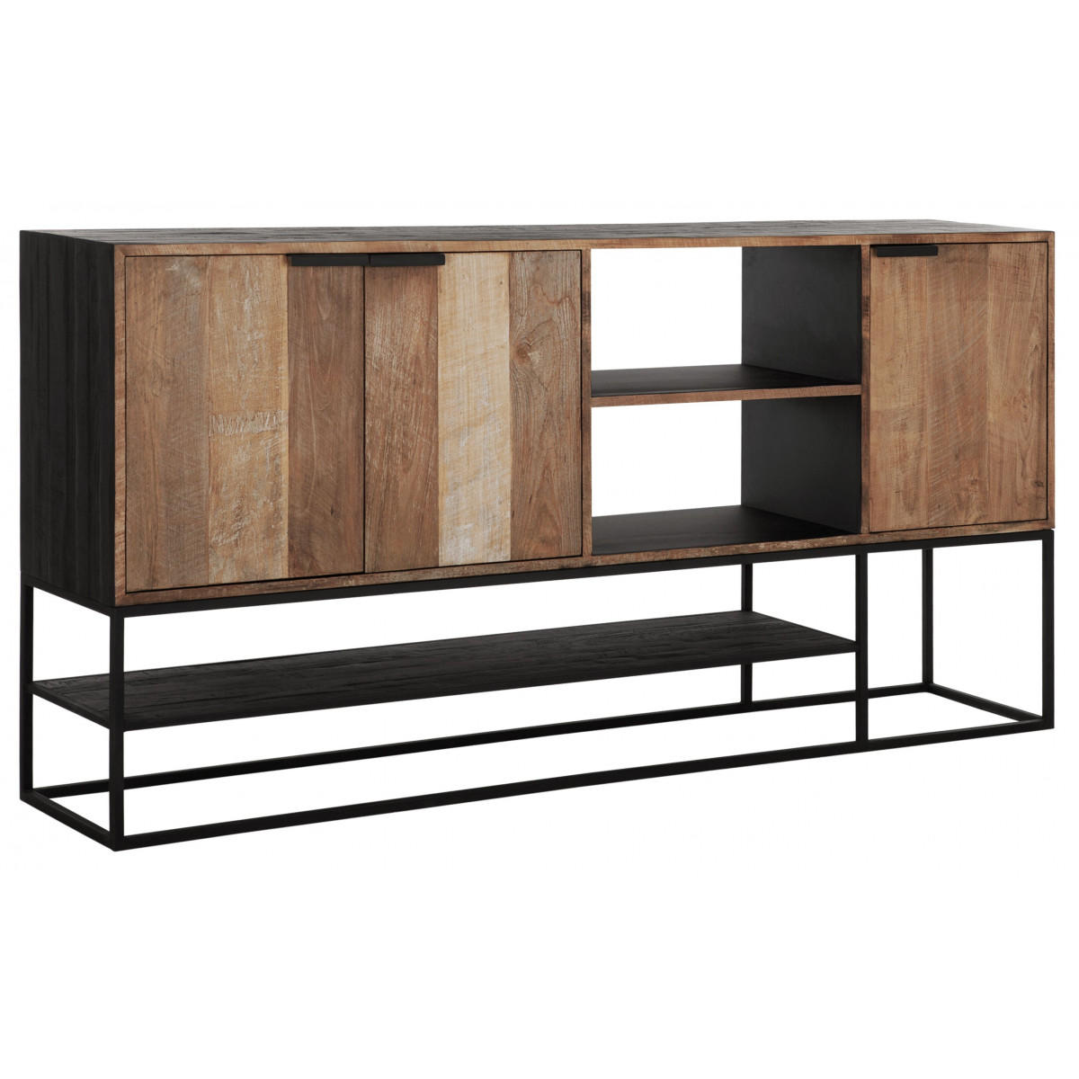 Komoda Cosmo kombinuje přírodní teakové dřevo a černou železnou konstrukci, což vytváří pozoruhodně přirozený a autentický vzhled. Nábytek měří 205x40x100 cm a má 3 dveře a 2 otevřené police.