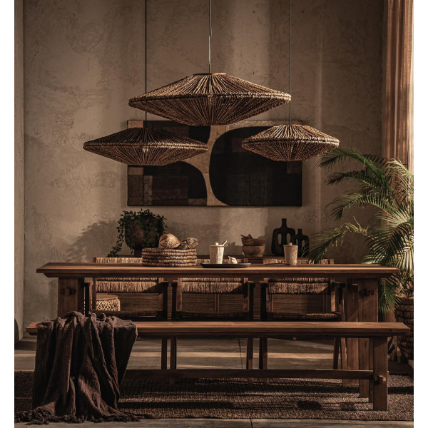 Tato závěsná lampa činely Abaca je inspirována tradiční indonéské klobouk „Topi caping pak tani“ a tvar činely, tato pozoruhodná závěsná lampa je chytře zabalené v kůře Abaca na ratanové struktuře, vytváří rustikální a příjemný tkaný vzhled. Projektuje krásné teplé světlo a jeho ikonický vzhled evokuje tradiční asijské sluneční klobouky, což z něj dělá skutečně jedinečný kousek v
