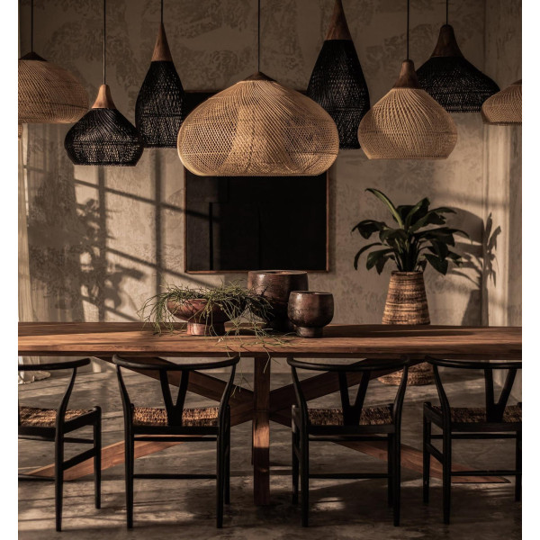 Tato závěsná lampa Bell je elegantní lampa, která přináší světlo snem. Přívěsek slza nabízí přesné a organické ručně tkané ratanové detaily po celé straně, pečlivě vytvořený pomocí tradiční jávské techniky. K dispozici v různých velikostech a v povrchové úpravě z přírodního nebo dřevěného uhlí. Krásná sama nebo se mísí s různými barvami a velikostmi.