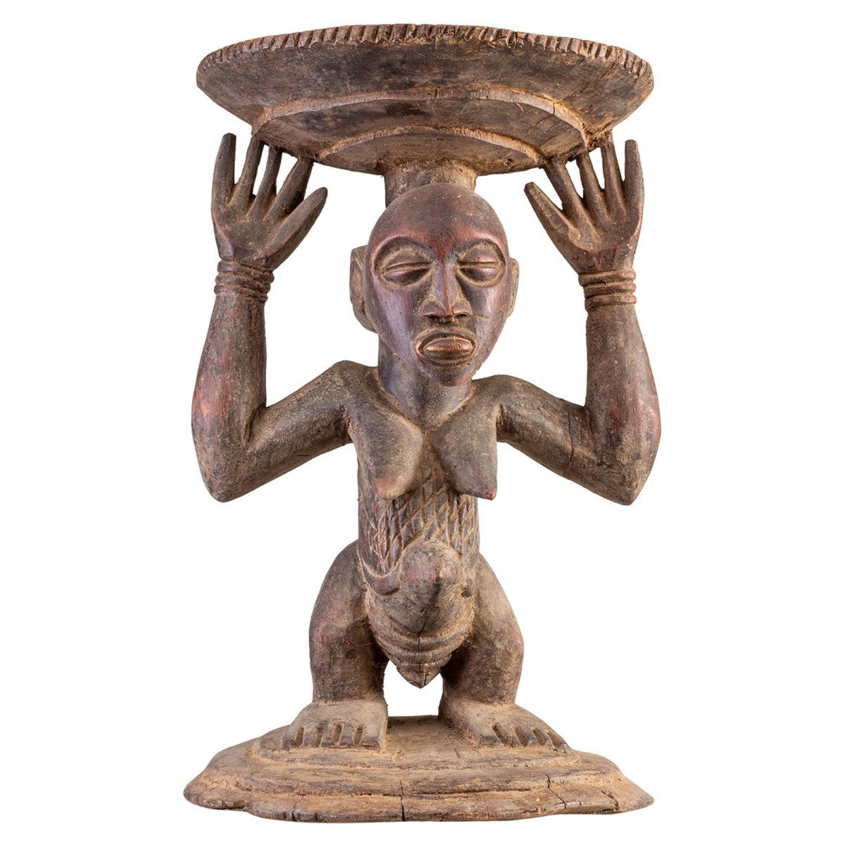 Tato královská stolička AAA1210 Luba je výjimečným uměleckým dílem a řemeslem, které sahá až do 20. století. Pochází z Demokratické republiky Kongo a pochází z kmene Luba. Stolička je vyrobena výhradně ze dřeva a měří 31x32x50 cm. Design stoličky je figurativní a obsahuje dvě stylizované ženské karyatidy. Tyto karyatidy jsou vyřezávány v mírně zakřivené póze a podporují sedadlo stoličky. Jejich hlavy jsou zdobeny složitými účesy a jejich těla jsou zdobena geometrickými vzory. Královská stolička Luba je jedinečným uměleckým dílem a řemeslem, které svědčí o bohatství a složitosti kultury Lu