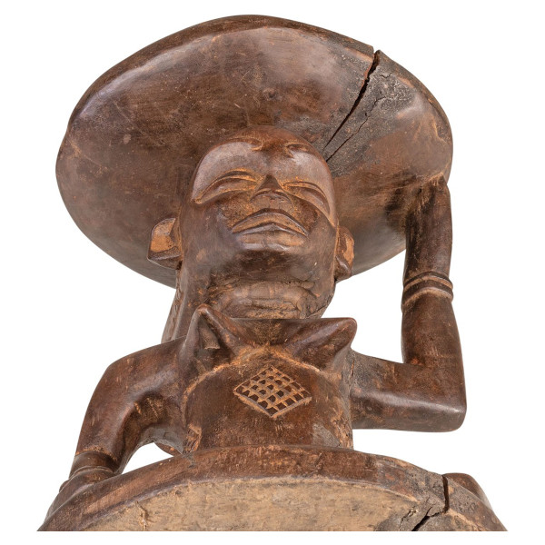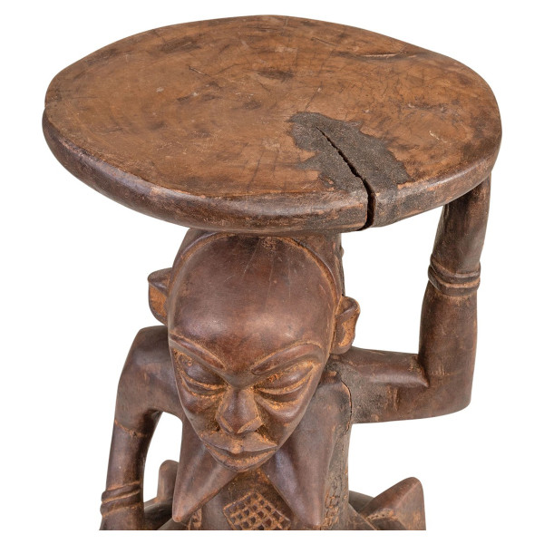 olička Luba z 20. století z Demokratické republiky Kongo, tento dřevěný kus 24x26,5x39 cm přesahuje svou funkci sedadla. Mocný symbol moci, v něm je umístěn duch vůdce. Navzdory patriarchální společnosti řídí nástupnictví ženská linie, ztělesněná karyatidy ctějícími ženské předky. Sochařská tradice Luba, uctivá královským vůdcům.