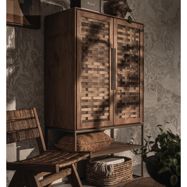 Šatní skříň Karma je ručně vyráběný kus nábytku vyrobený z regenerovaného teaku, se dvěma ručně tkanými teakovými dveřmi a otevřenou přihrádkou. Jeho železný rám je zakončen nádherným matným mosazným efektem, který nabízí klasický a rafinovaný vzhled. Elegantně strukturované dveře skrývají uvnitř šest odnímatelných polic, což vám umožní udržet vaše věci dokonale uspořádané. Jednotka měří 95x45x165 cm.