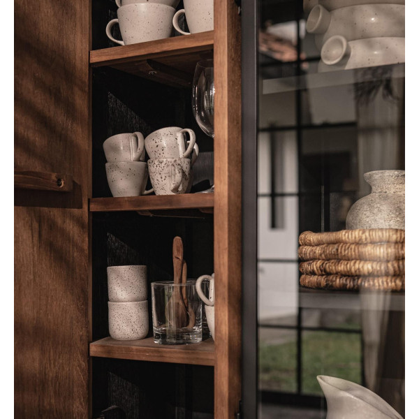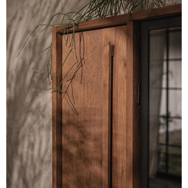 Skříň Outline se třemi dveřmi, z nichž 2 jsou skleněné, je kus nábytku v moderním a průmyslovém stylu. Ručně vyrobené z regenerovaného teakového dřeva a železného rámu, tato robustní skříňka nabízí dostatek prostoru. Za dvěma skleněnými dveřmi jsou tři police, zatímco dřevěné dveře dokonce odhalují čtyři police, které splňují všechny vaše potřeby skladování. Díky svým rozměrům 95x38x160 cm je tato skříňka praktická i estetická.