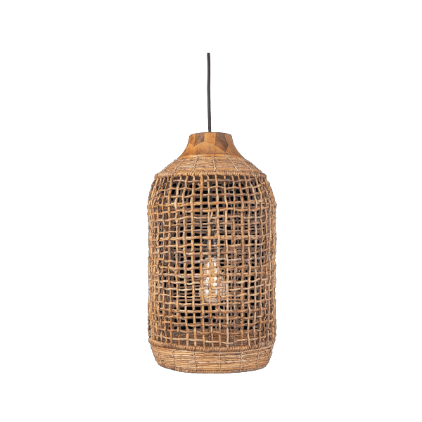 Závěsná lampa Brandy Koi je lampa se stínítkem vyrobeným z kovového rámu a chytře zabalená do kůry abaca, aby vytvořila rustikální a příjemný tkaný vzhled. Lampa je poté zakončena hřebenem regenerovaného teaku otočeného ručně. Promítá krásné mřížové světlo na povrchy a stěny a kolekce Brandy Koi vylepšuje
