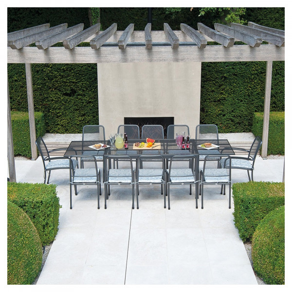 Tento rozkládací stůl z řady Portofino od Alexandra Rose je ideální pro rodinu. Jeho jednoduchý a vzdušný design umožňuje použití jako zahradní nábytek a jako vnitřní nábytek. Tento stůl je nastavitelný v délce 150 až 270 cm a má celkový rozměr 150/270x90x74 cm. Jeho šedá barva je ultramoderní a praktická. Tento nábytek se může ubytovat až 12 osob.