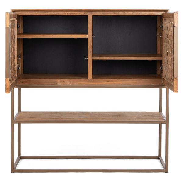 Dieses Karma-Sideboard ist eine hochwertige Aufbewahrungseinheit, die aus wiedergewonnenem Teakholz, Bambus und Eisen handgefertigt wurde. Das elegante Vintage-Design verleiht Ihrem Zuhause einen Hauch von Charme. Die beiden strukturierten Bambustüren verbergen vier herausnehmbare Regale zur einfachen Aufbewahrung, während die untere Ablage perfekt ist, um Ihre Lieblingsbücher oder Einrichtungsgegenstände auszustellen. Der Eisenrahmen ist aus mattem Messing gefertigt, um eine hochwertige Oberfläche zu erzielen. Mit seinen Abmessungen von 105,5 x 40 x 110 cm ist die Karma Pure High Dresser ein geräumiges und praktisches Möbelstück, in dem Sie Ihre Sachen aufbewahren und gleichzeitig Ihrer Einrichtung einen Hauch von Stil verleihen
