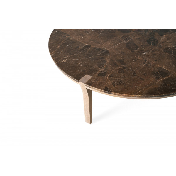 Der runde Couchtisch Corner des Designers Pierre Dubourg besticht durch sein Design und die Qualität seiner Materialien. Seine Beine und sein Sockel sind aus massivem Eichenholz gefertigt und seine Tischplatte besteht aus hochwertigem Marmor. Dieser charaktervolle Couchtisch misst Ø120x40 cm.