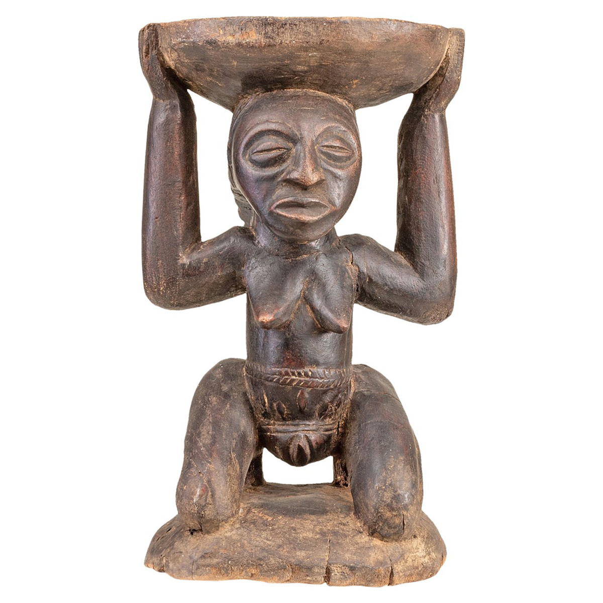Dieser Luba-Hocker aus dem 20. Jahrhundert aus der Demokratischen Republik Kongo ist ein starkes Symbol für Macht und Autorität. Er ist aus Naturholz gefertigt und misst 24,5 x 24,5 x 40 cm. Die weibliche Karyatide, die das Tablett trägt, stellt einen Vorfahren dar und symbolisiert die Kontinuität der königlichen Linie. Dieser Hocker wurde von den Häuptlingen der Luba verwendet, um bei wichtigen Zeremonien wie der Inthronisierung oder dem Urteil zu sitzen. Er ist einzigartig und zeugt von der reichen Kultur und Geschichte des Luba-Stammes.