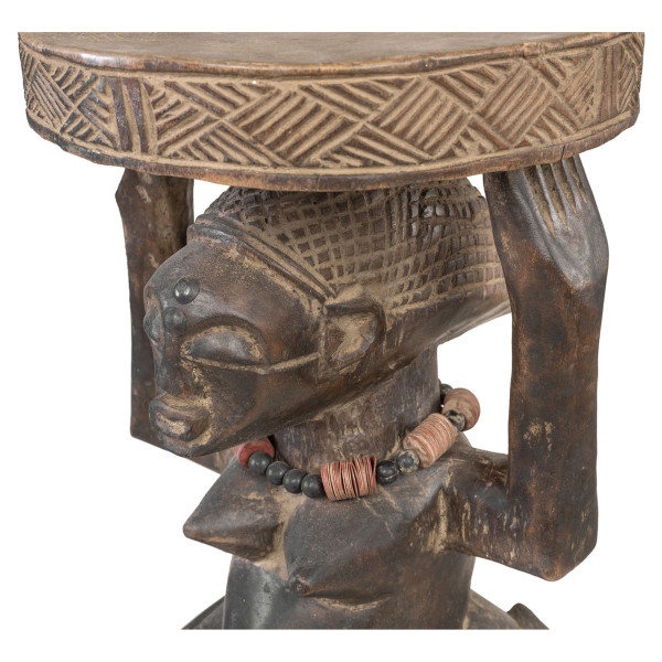 Die königlichen Luba-Stühle sind zwar funktionell, dienen aber eher als sakrale Dekoration, die in königlichen Palästen aufbewahrt wird, als als Sitze. Ihr Design, ob abstrakt oder figurativ, enthält manchmal weibliche Karyatiden, was die Luba-Vision des weiblichen Körpers als spirituelle Hülle zur Unterstützung des göttlichen Königtums zum Ausdruck bringt. Dieser Hocker aus der Mitte des 20. Jahrhunderts ist 23 x 24 x 40 cm groß und vollständig aus Naturholz gefertigt. Er verkörpert die reiche kulturelle Tradition der Luba in der Demokratischen