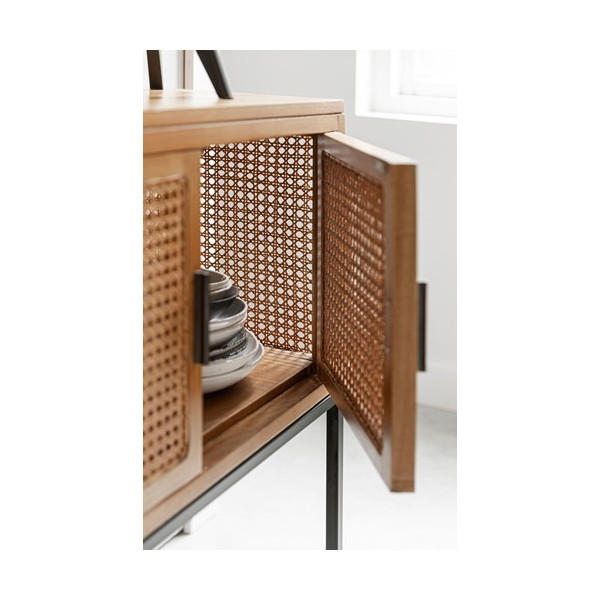 Die Tribute-Kommode bringt skandinavischen Stil kombiniert mit einem industriellen Touch ins Schlafzimmer. Die Möbel sind aus Rattan, Mindi-Holz, Riemen und einem schwarzen Metallfuß gefertigt. Seine weiche natürliche Farbe wird den Innenraum sublimieren und Stauraum bieten. Es besteht aus vier Türen und ist mit einer Abmessung von 160x40x90 cm ausgestattet.