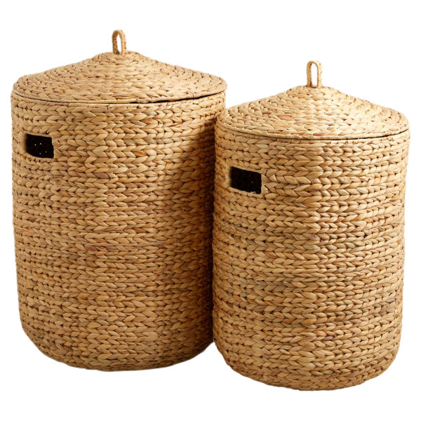 Das Cosna-Set mit zwei Wäschekörben ist ideal, um Ihr Zimmer aufgeräumt und sauber zu halten. Wasserhyazinthe macht diesen Wäschekorb langlebig. Cosna hat Löcher auf jeder Seite für einen einfachen Transport. Ihre Größen sind ø41x69 cm und ø48x74 cm.