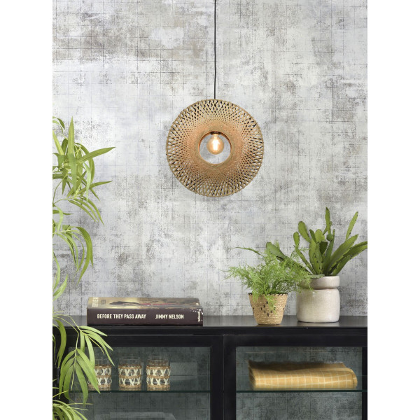 Die Hängelampe Kalimantan Vertical, die Bambus und Eisen kombiniert, bringt nicht nur ein sanftes Licht, sondern auch einen Hauch von Modernität in einen Raum. Sie zeichnet sich durch einen Durchmesser von 44 cm und eine Basis von 11 x 4 cm aus. Diese Leuchte verfügt über eine E27-Fassung (Glühbirne nicht im Lieferumfang enthalten).