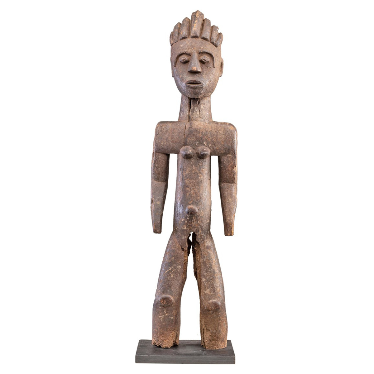 Diese Bloo Bla Weissagungsfigur ist eine einzigartige 19x26,5 x 88 cm große Holzskulptur, die eine Frau darstellt. Sie ist in die Form einer idealen Frau geformt, mit langen Haaren, mandelförmigen Augen und einem freundlichen Lächeln. Diese Figur aus der Mitte des 20. Jahrhunderts ist daher ein kostbares Objekt, das sowohl schön als auch bedeutsam ist. Es ist ein Zeugnis der Kunst und Kultur der Baoulé-Völker und ihres Glaubens an die Macht der Ahnengeister. Es ist ein Stück aus der
