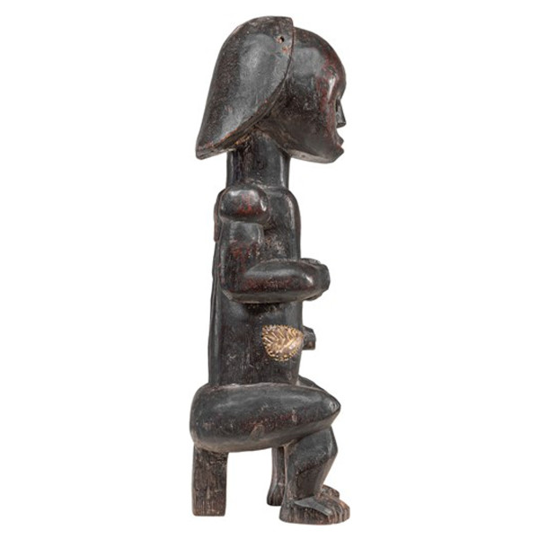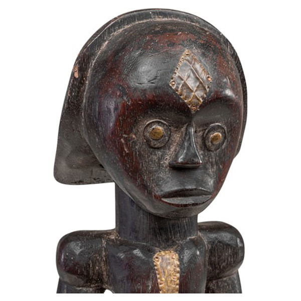 Diese uralte Byeri-Ntumu Fang-Figur, ursprünglich aus Gabun, stammt aus der Mitte des 20. Jahrhunderts. Sie ist aus Hartholz geschnitzt und mit Metallelementen verziert. Die Figur hat kindliche Proportionen, einen breiten Kopf und einen schlanken Körper. Die Augen sind groß und ausdrucksstark, und das Gesicht ist von Schwerkraft durchdrungen. Der Körper ist muskulös und gut proportioniert, was der Figur ein kraftvolles und schützendes Aussehen verleiht. Diese althergebrachte gabunische Krokodilfigur ist ein einzigartiges und kostbares Objekt. Sie hat eine Abmessung von 16x15x51,5